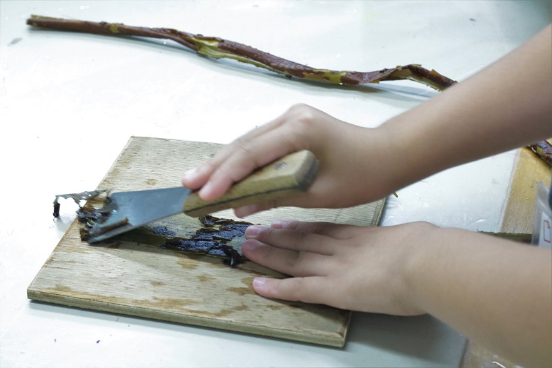 初日は和紙作りがメイン。和紙の原料を作るところから始めます。楮(こうぞ)という木の樹皮から、最も外側にある「クロカワ」と、そのすぐ内側にある「アマカワ」を、ヘラを使ってそぎ落とします。アマカワのさらに内側にある白い皮が、和紙の原料になるのです。なかなかうまく剥がせない子どもたちには、講師の田村正さん(以後「師匠」とお呼びします)がサポート。師匠の手にかかると、ツルリと皮が剥がれていきます。
