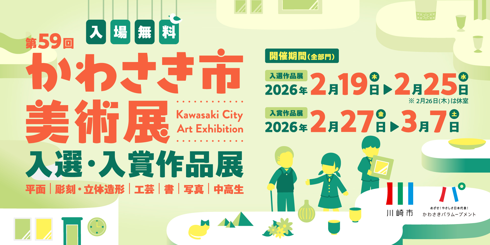 今回で59回目を迎える「かわさき市美術展」は、市民文化の発展に寄与すると共に、創作・鑑賞を通じた交流を目的とした、川崎市で最も歴史のある公募展です。 今年度も引き続き、川崎市に在住・在勤・在学、または市内で制作活動をしている方を対象に作品を募集します。