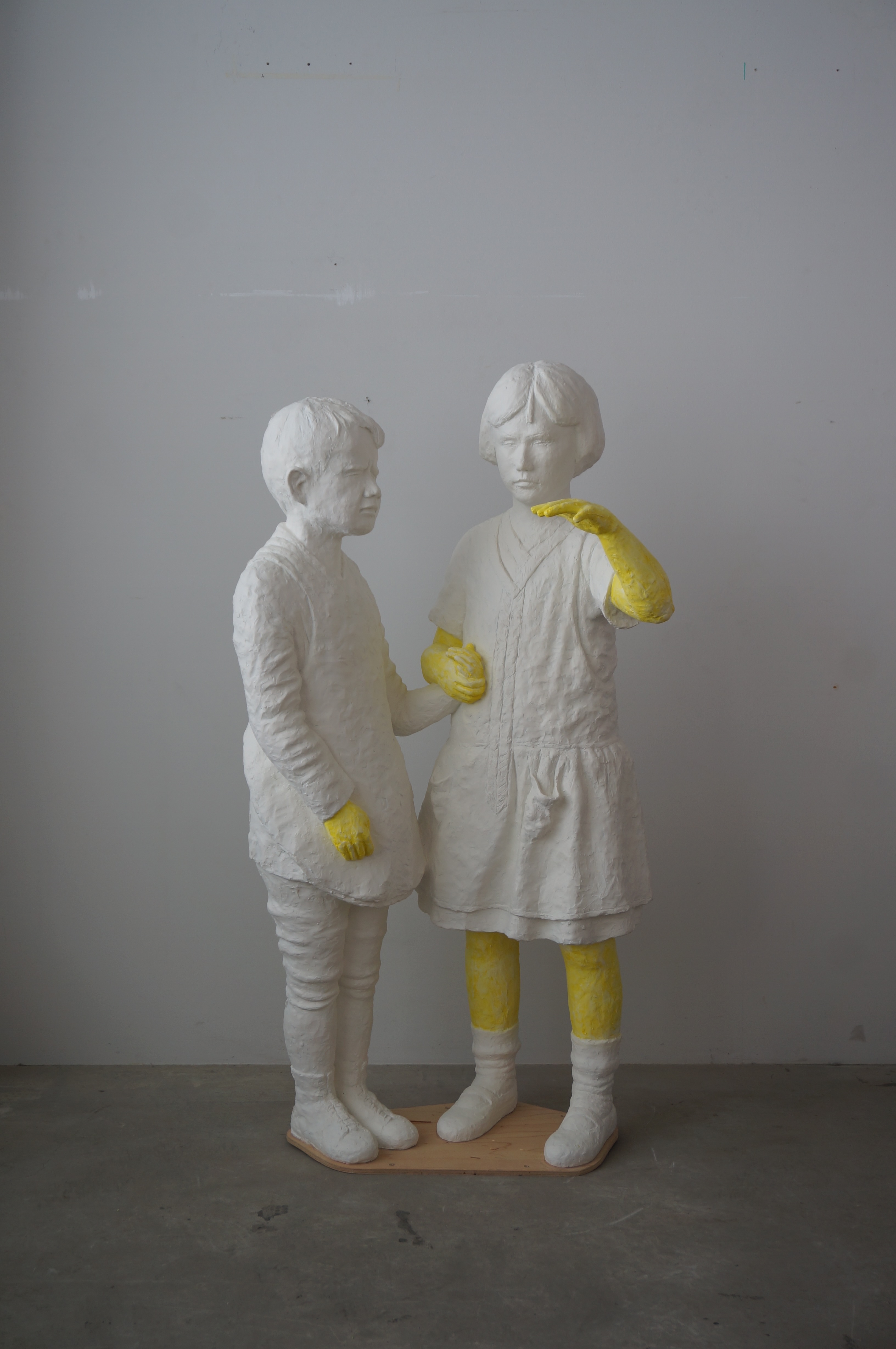 本展では、袴田氏のふたつの作品を中心に展開します。ひとつは3つのバラバラな要素が大きなカーテンを介して共存する作品《ザンダー》(令和5年)です。タイトルでもあるドイツの写真家アウグスト・ザンダー(1876-1964)の写真作品《盲学校の子ども》をモチーフにした人型の彫刻が、この作品の核となります。もうひとつは、川崎市ゆかりの彫刻家・圓鍔えんつば勝三かつぞう(1905-2003)の作品《裸婦と佛》をモチーフにした、発泡スチロールの積み重ねを用いて制作された高さ3mにもなる新作の大型作品です。いずれの作品にも、見えていないはずのものが創り出されていたり、不確かさの存在を認識しながら制作されていたりと、どこか曖昧で危うい何かが潜んでいます。