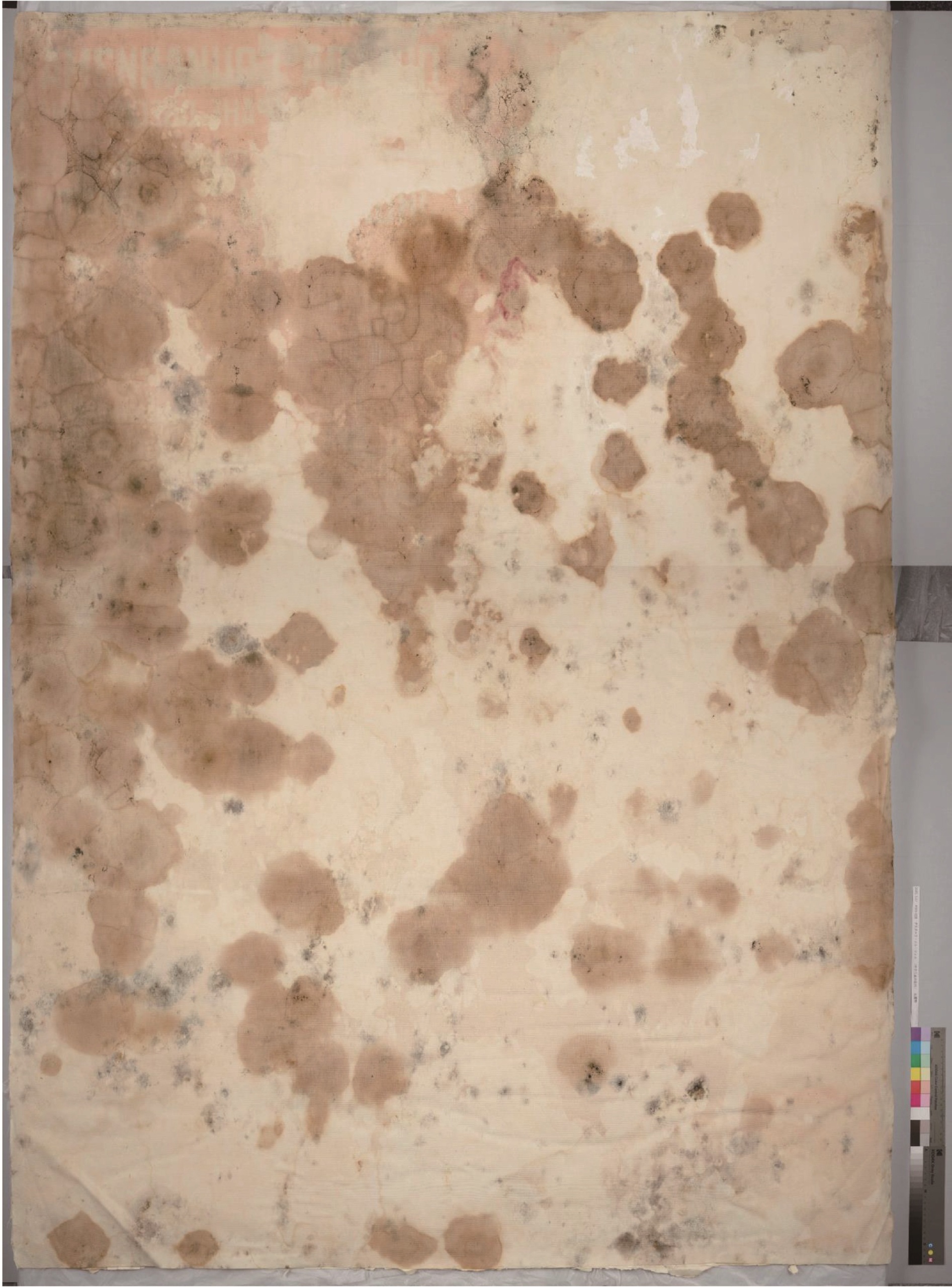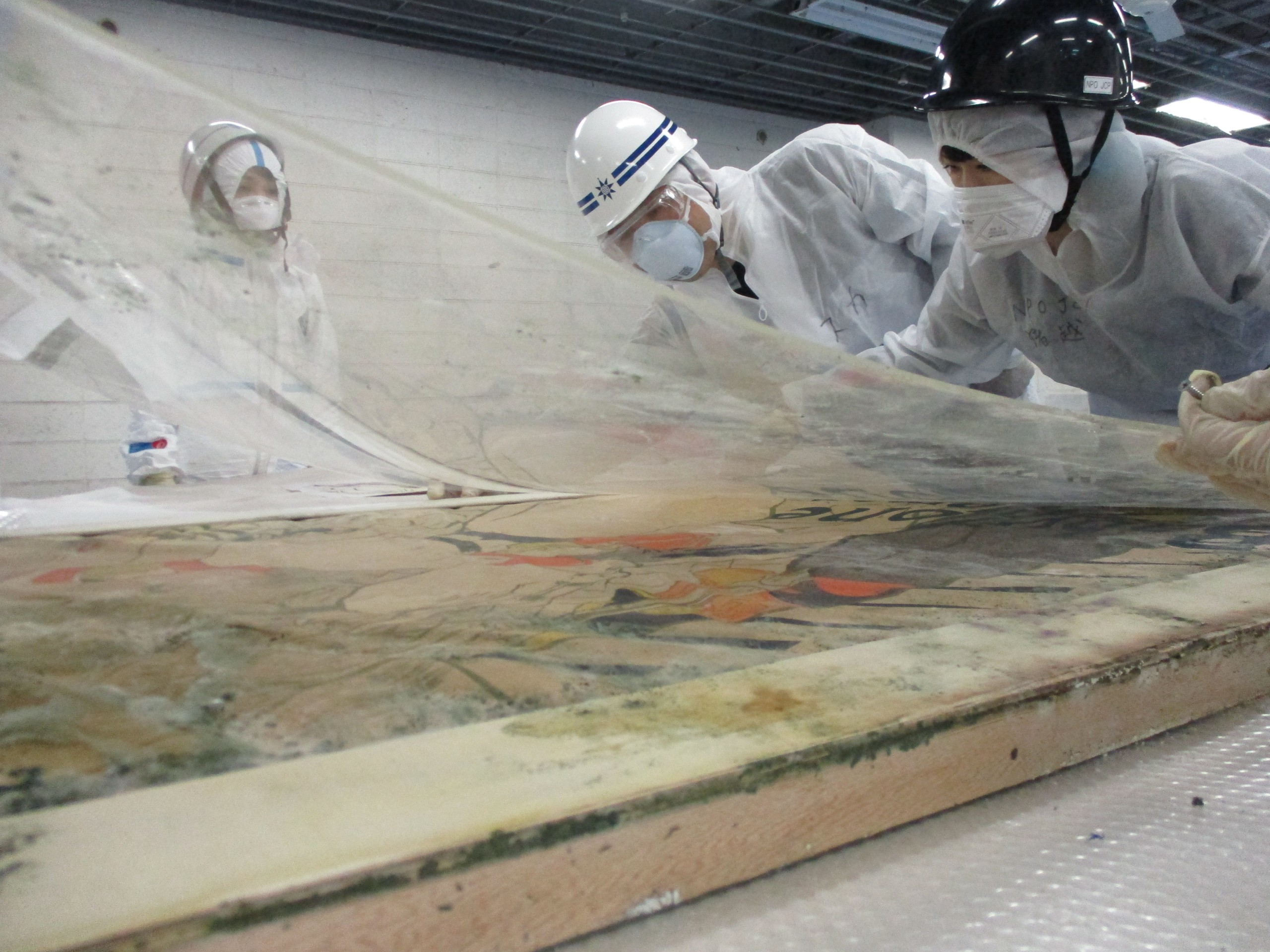 本作品はサイズが205×143cmと大型のため、こうした大きなサイズの作品を処置できる専門の修復業者に修復を依頼することになりました。作品は全体にカビが繁殖し、本紙に硬く定着、また泥水が入ったことにより、全体的に染みや汚れ、波打ち状の変形が強く生じていました。作品の本紙は非常に薄く、泥水やカビにより酸性に傾き、脆弱化して柔軟性を失っている状態で、修復の作業には慎重さが求められます。行われた修復の処置について、いくつかご紹介しましょう。