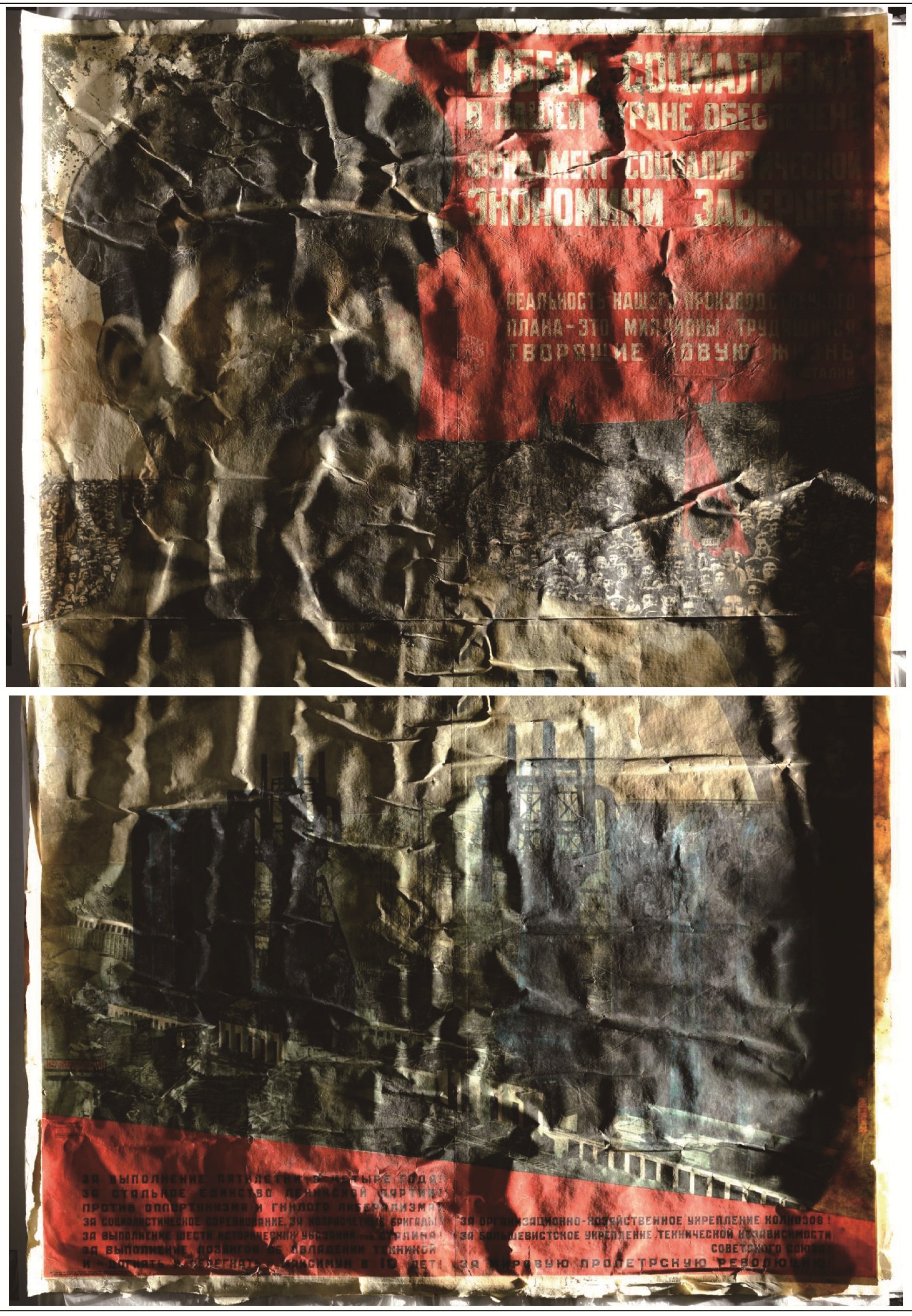 本作は「我が国における社会主義の勝利が保障される。社会主義の基盤が完成される。」というスローガンとともに、スターリンの経済政策の重要性を強調する内容となっています。画面にはスターリンの肖像を中心に工場や民衆の写真が組み合わされており、写真をコラージュして画面構成するフォト・モンタージュの技法が用いられました。フォト・モンタージュは写真を効果的に配置することで、見る人に強い視覚的な印象を与える点が特徴です。