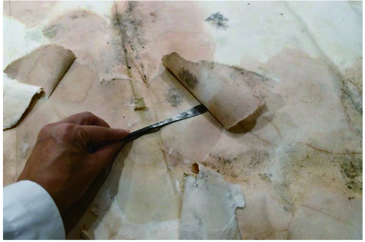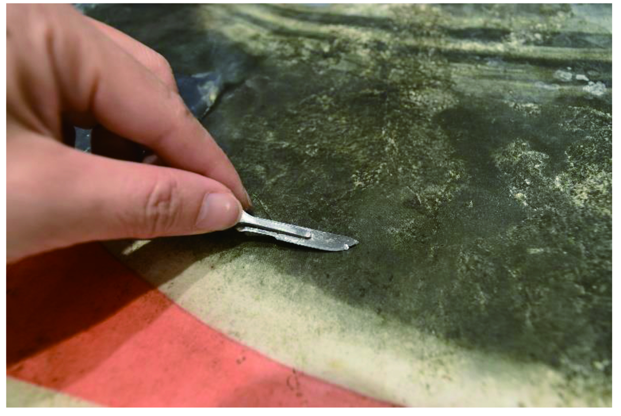 本紙に接着された裏打ちの布を剥がしました。本紙を傷めないように、裏返しにして慎重に裏打ち布や被災前に処置された古い修復の補填紙を取り外してゆきます。本紙の裏に貼り付けてある薄い紙は接着が強かったため、ジェルを塗布して接着剤を緩ませてからメスを使用して取り除きました。