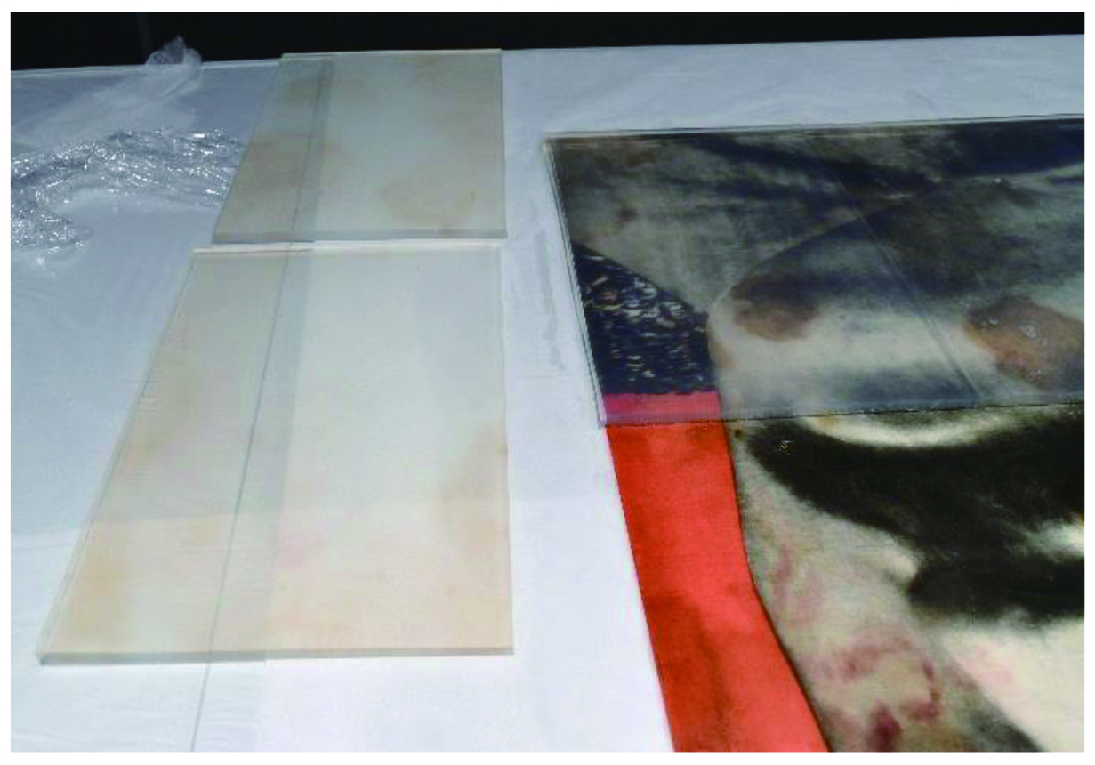 本紙内部の汚れや可溶性の酸を洗い流すため、水による洗浄処置を行います。本紙は薄く、脆弱化していたため、僅かな水分で洗浄可能なゲランガムというゲルを作品表面に約50分接着し、汚れを吸着させました。このゲルは被災で傷んだ作品の表面を傷めずに汚れを除去することが出来ます。