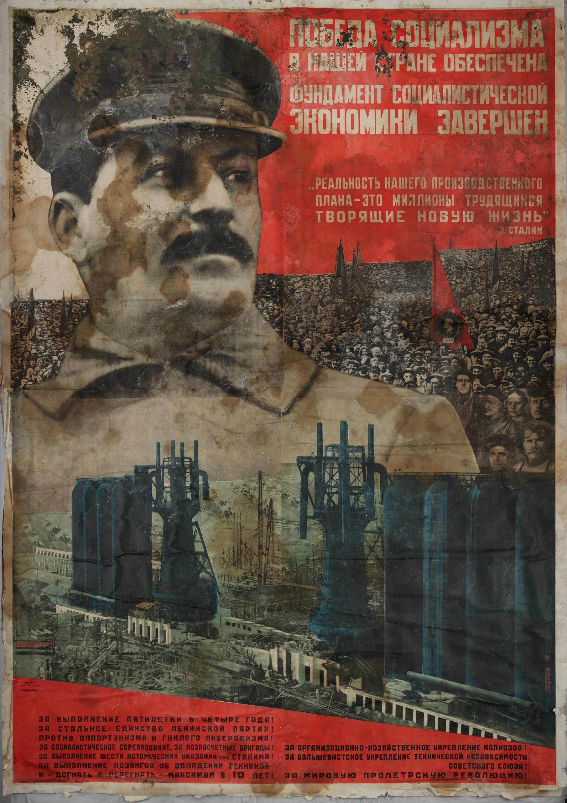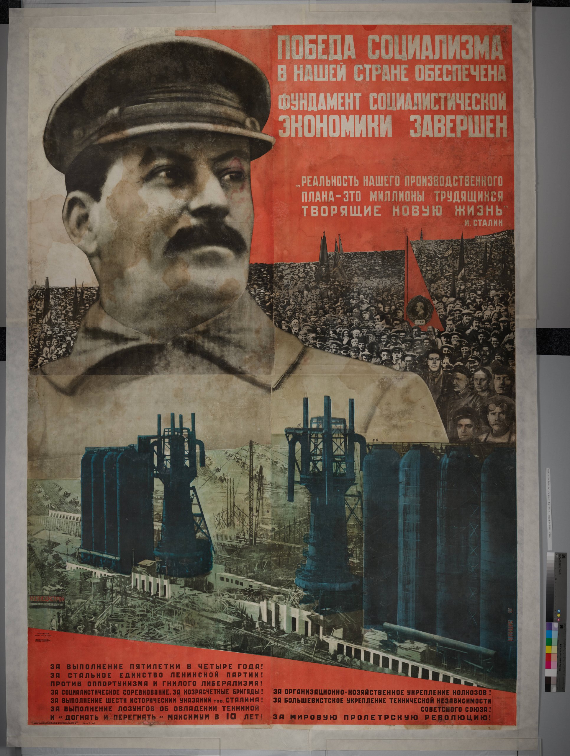 本作は「我が国における社会主義の勝利が保障される。社会主義の基盤が完成される。」というスローガンとともに、スターリンの経済政策の重要性を強調する内容となっています。画面にはスターリンの肖像を中心に工場や民衆の写真が組み合わされており、写真をコラージュして画面構成するフォト・モンタージュの技法が用いられました。フォト・モンタージュは写真を効果的に配置することで、見る人に強い視覚的な印象を与える点が特徴です。
