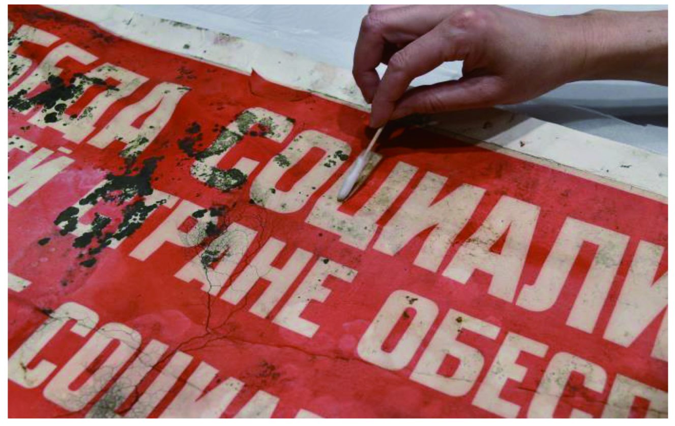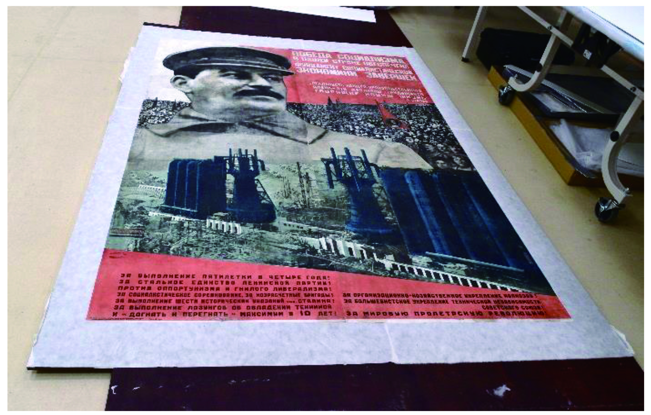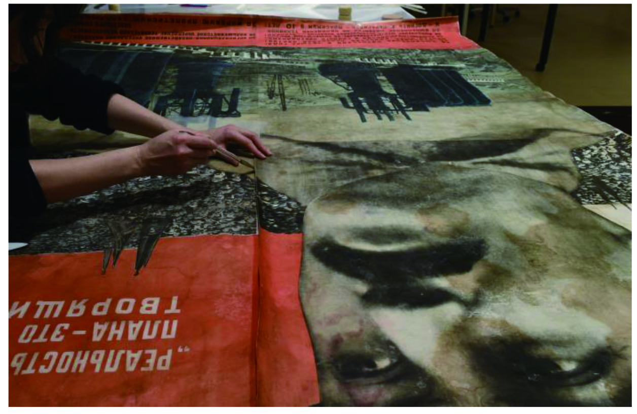 本作品の修復は2023年4月から2024年2月まで、約10か月にわたり処置が行われました。応急処置から修復まで、様々な方に関わっていただきました。当館はこうしたソ連のプロパガンダポスターを多数収蔵しており、将来的には修復を終えた作品を展覧会などの機会でご紹介できればと思います。