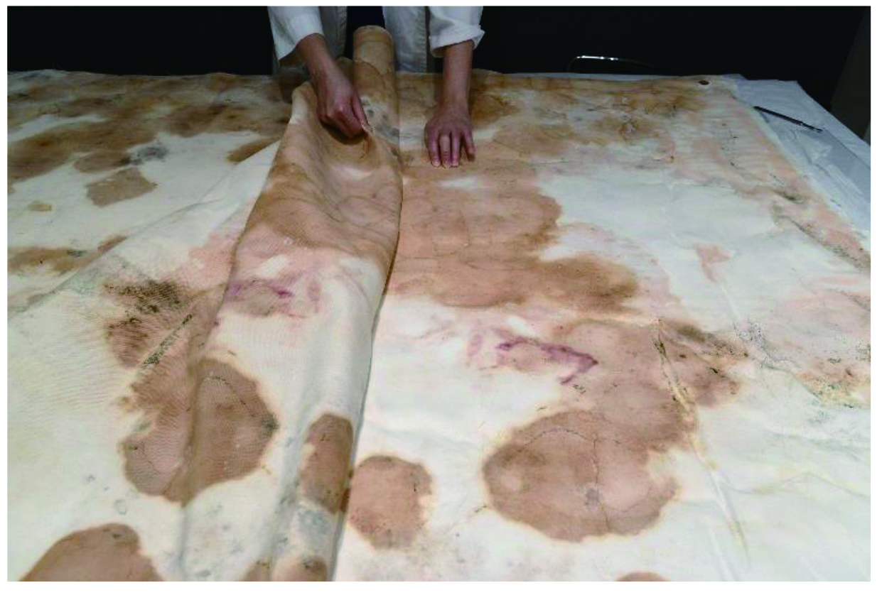 本作品はサイズが205×143cmと大型のため、こうした大きなサイズの作品を処置できる専門の修復業者に修復を依頼することになりました。作品は全体にカビが繁殖し、本紙に硬く定着、また泥水が入ったことにより、全体的に染みや汚れ、波打ち状の変形が強く生じていました。作品の本紙は非常に薄く、泥水やカビにより酸性に傾き、脆弱化して柔軟性を失っている状態で、修復の作業には慎重さが求められます。行われた修復の処置について、いくつかご紹介しましょう。