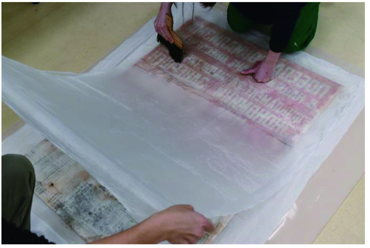 本紙に接着された裏打ちの布を剥がしました。本紙を傷めないように、裏返しにして慎重に裏打ち布や被災前に処置された古い修復の補填紙を取り外してゆきます。本紙の裏に貼り付けてある薄い紙は接着が強かったため、ジェルを塗布して接着剤を緩ませてからメスを使用して取り除きました。