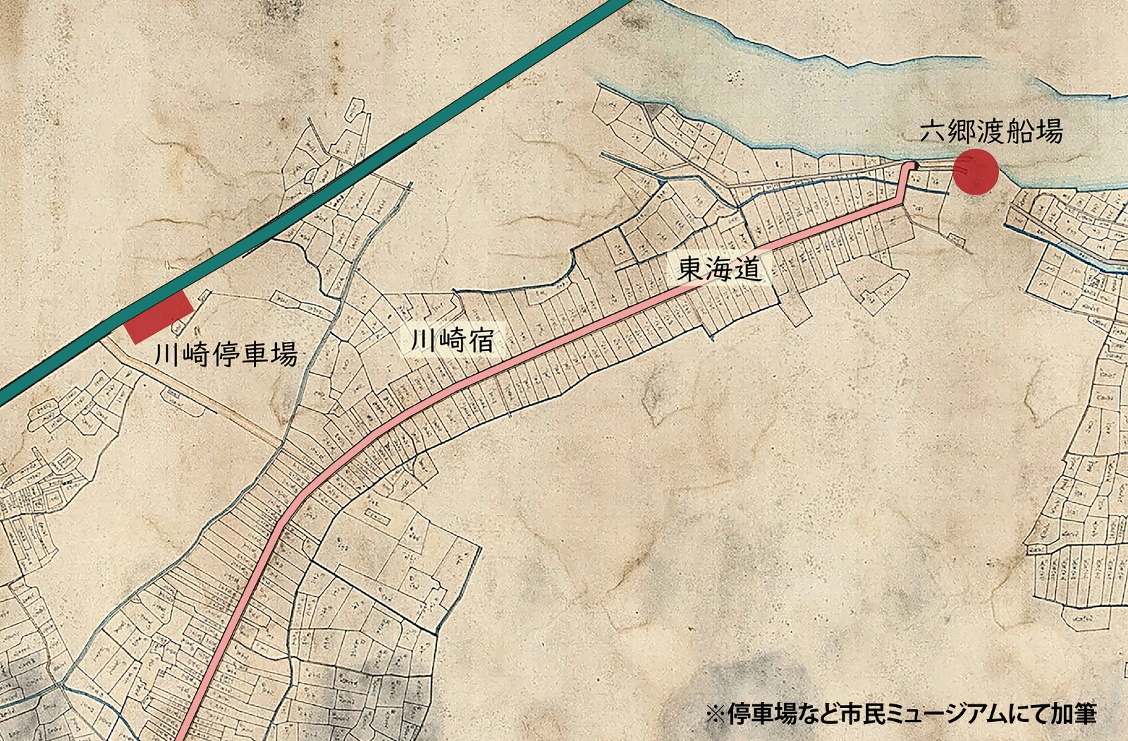 鉄道が川崎宿に並行して伸びていることが分かる。