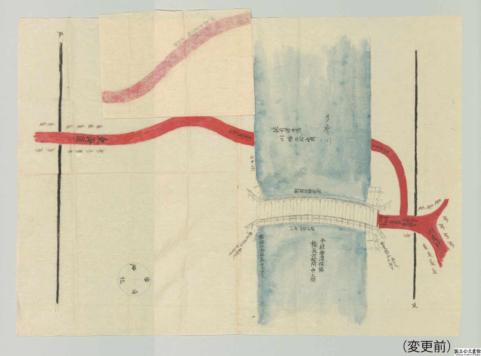 本計画に対し、東京府からは「渡船場と異なり水の流れが強く川底が深いため、橋を維持するには覚束なく思われる」という意見が出たものの、水害のないよう出来るだけ手厚く造営するとして新道敷設・架橋工事は進められました。